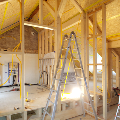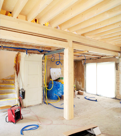 Baustellenfoto: 60 cm Höherlegung des Bodens Obergeschoss für mehr Raumhöhe im Erdgeschoss. Offene Balkendecke mit schmalen Brettern in engem Raster. Der hohe Raum verbindet den strassenseitigen mit dem rückseitigen Garten. |