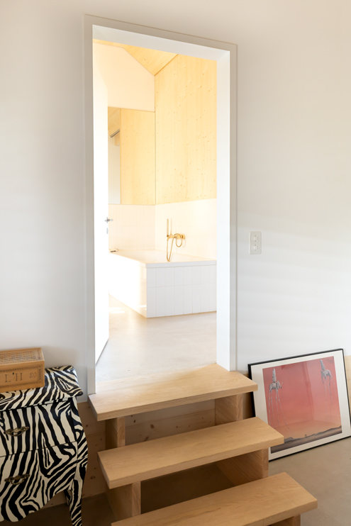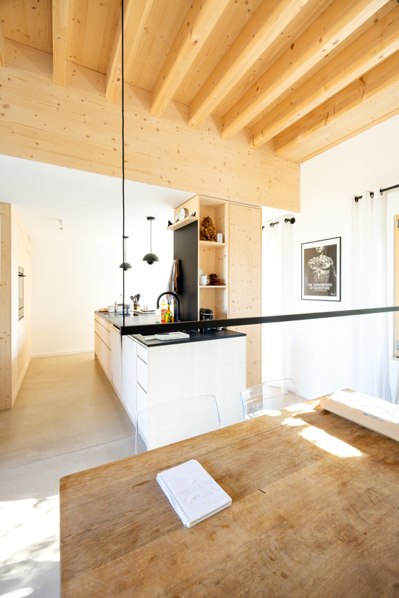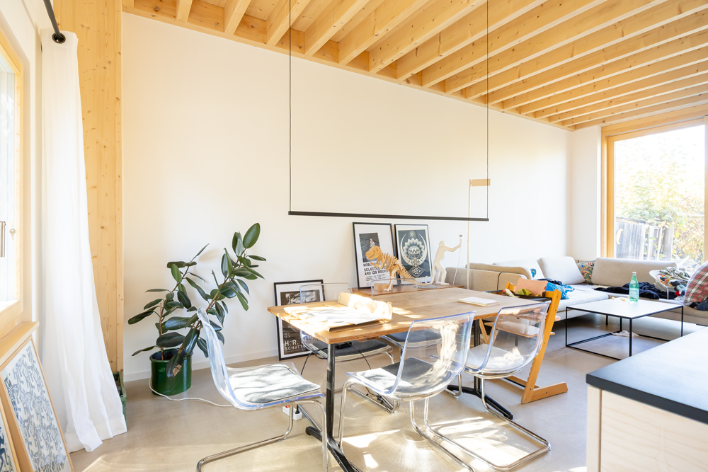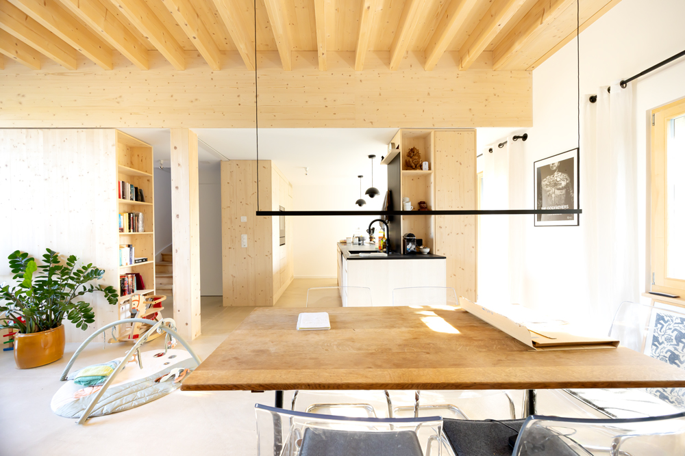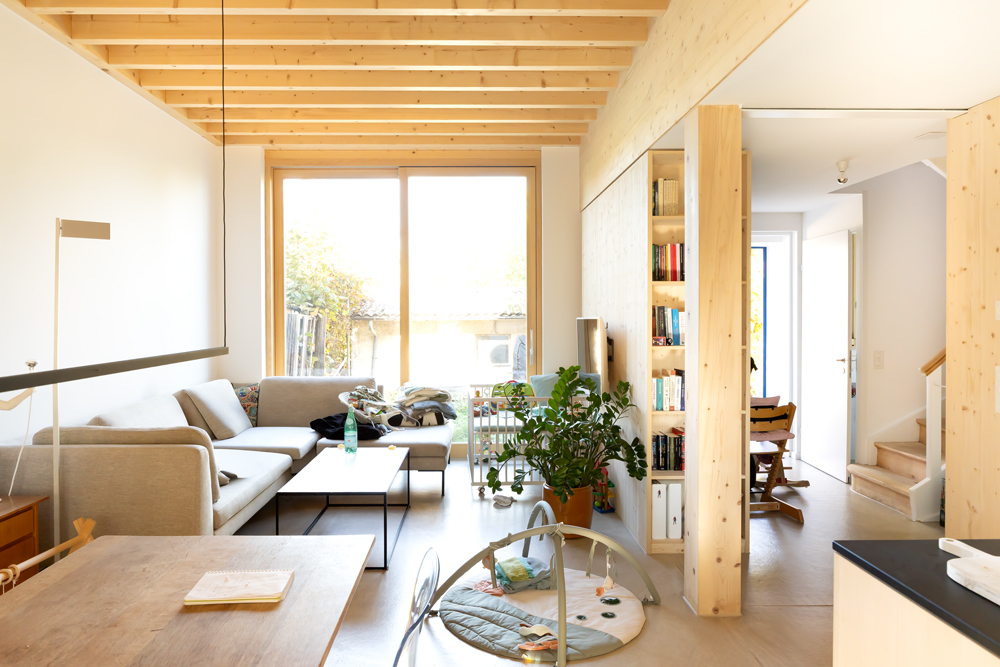 Umbau Doppelhaushälfte Hürstholz Zürich Kreis 11 Planung 2023 | Fertigstellung März 2024| Fotos nijo architekten Das Haus ist Teil der am Stadtrand gelegenen Siedlung Hürstholz. Diese Siedlung besteht aus typengleichen Doppelhäusern: Minimale Häuser mi tvier Zimmern, knappe 50m2 Grundfläche, asymmetrisches Dach, dazu ein langgezogener schmaler Gartenteil. Unser Konzept besteht darin, die Zimmerstruktur im Erdgeschoss aufzulösen und einen offenen Wohnraum zu schaffen. Mit dem Entfernen der Trennwände bliebe der kleine Grundriss immer klein und beengend, daher wurde die Decke um 60cm erhöht. Diese Erhöhung bringt ein unglaublich grosszügigeres Raumgefühl ins Haus. Auf der Gartenseite ist nun ein überhohes Schiebefenster möglich geworden, welches viel Tageslicht und den Garten ins Haus hereinholt. Im Obergeschoss bildet die Erhöhung einen Versatz, an welchem sich das neu organisierte Dachgeschoss orientiert. Auf der bestehenden Bodenhöhe befindet sich ein kleiner Vorplatz mit Treppe und ein neu bis unter den First reichendes Schlafzimmer. Über drei Stufen gelangt man auf den höher gelegten Teil mit Badzimmer und einem weiteren Dachzimmer mit der neuen Dachgaube. Der Umbau ist hell, freundlich und warm materialsiert: Massives Fichtenholz, Dreischichtplatten aus Fichte, massive Esche in der Küche, geölter Anhydrit Gussboden, weisse Wände und weiss lackiertes Holzwerk. Die Küche wurde neu auf die Strassenseite des Hauses platziert. Von hier aus sieht man was im Quartier geht und kommt in den Genuss von viel Sonne. Die Küche besitzt neu einen direkten Gartenzugang. Die Küche ist komplett innen (Fichte) und aussen (Esche) aus Massivholz gebaut. Die Hochschränke aus Fichten-Dreischichtplatten. Vielen Dank an David Müller, D-Art Design, für die sorgfältig gebaute schöne Küche. Die höhergesetzte offene Holzbalkendecke besteht aus hoch / schmal proportionierten Balken, in engem Raster gesetzt. In dieser Art wirkt sie nicht ländlich sondern zeitgenössisch jugendlich und städtisch.
