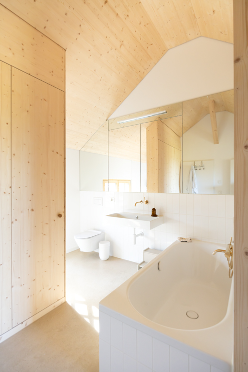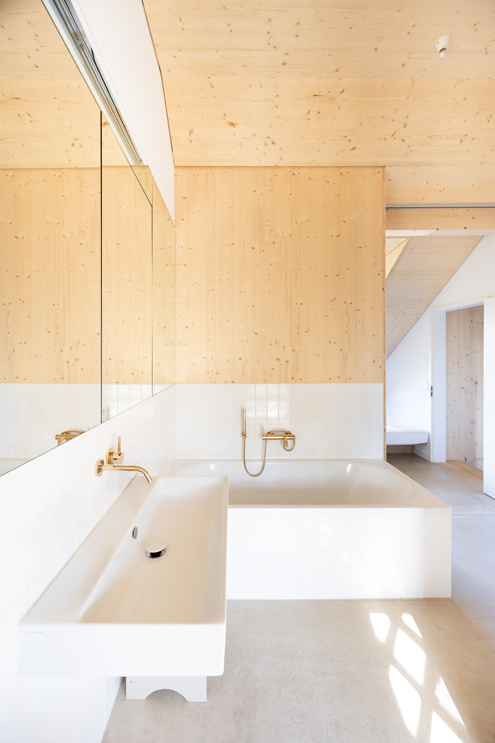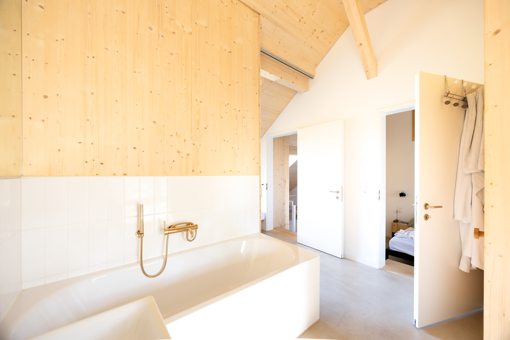 Die Bauherrschaft legte grossen Wert auf energetische Massnahmen und ökologische Materialien. Ausser der Nordfassade entspricht die Gebäudehülle in allen Bauteilen den bauphysikalischen Neubauanforderungen. Die bisherige Gasheizung und der Elektro-Warmwasserboiler wurden durch eine Aussenluft-Wärmepumpe ersetzt, die Heizkörper-Radiatoren wurden auf maximal 45°C Vorlauf-temperatur ausgelegt. Auf dem Dach der Miteigentümer wurde eine Indach-Fotovoltaikanlage erstellt und ein Zusammenschluss zum Eigenverbrauch ZEV gegründet. Die bisherigen Dachziegel wurden für die Neueindeckung wiederverwendet. Die neuen Holzoberflächen wurden unbehandelt belassen, die Holzküche und die bestehenden Riemenböden wurden geölt. Für Anstriche wurden ausschliesslich baubiologische Naturharz-Ölfarven verwendet. Auf die neuen Lehmbauplatten und -putze wurde abschliessend ein eingefärbter Lehmedelputz aufgebracht. |