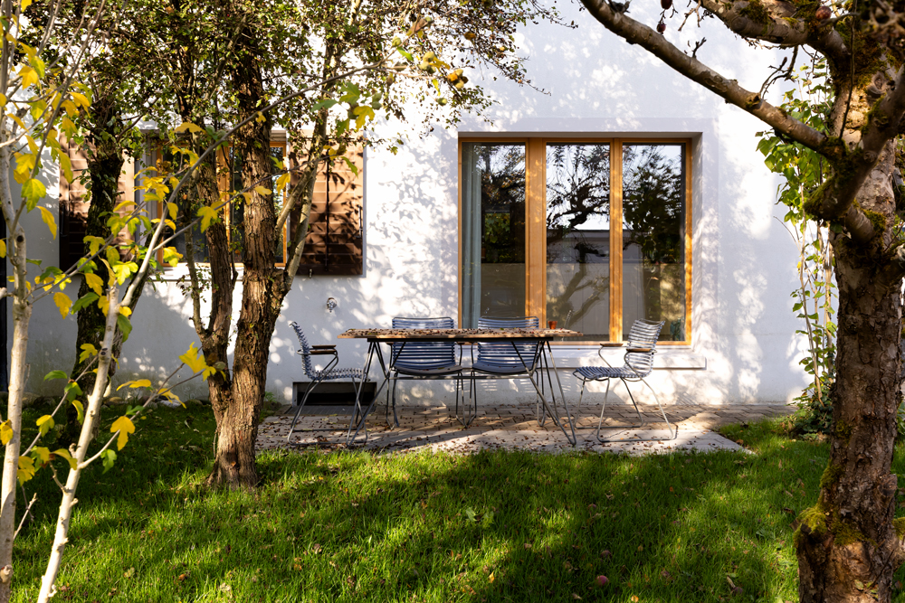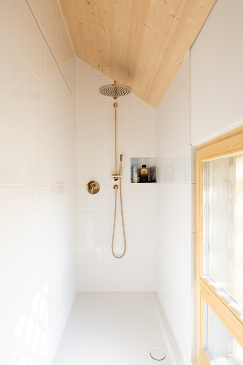 Umbau 40er Jahre Reihenhaus Zürich Oerlikon Planung 2020 | Fertigstellung Herbst 2021 | Fotos nijo architekten Das Reihenhaus ist ein typisches enges Arbeiterhaus mit Hochparterre-Erdgeschoss. Das kleine Wohnzimmer entsprach mehr oder weniger der Fläche des Schlafzimmers im OG. Auf der Stirnseite hatte es noch etwas Platz bis zum Grenzabstand, daher war hier ein Anbau für ein vergrössertes Küche/Essen/Wohnen möglich. Der Anbau, ein vorgefertigter Holzelementbau, steht auf dem neu betonierten Keller. Im Innenraum sollten Alt und Neu möglichst fliessend miteinander verschmelzen und räumlich zu einem neuen grossen Ganzen zusammenwachsen. Zudem sollte sich der Anbau dem Garten annähern, deshalb befindet sich die Wohnebene auf halbem Weg zum Garten drei Stufen tiefer als das bestehende Erdgeschoss. Die offene Küche befindet sich im Altbau, ist aber räumlicher Bestandteil des neuen Anbaues, der neue Raum greift sozusagen retour in das bestehende Haus hinein. Die Giebelfassade wurde abgebrochen, das Holztragwerk mit der markanten Diagonalverstrebung übernimmt neu die Lastabtragung von Obergeschoss und Dach. Die Küche sollte nicht eine niedrige Restraum-Anhängsel-Nische sein, daher wurde die Decke höhergelegt, es sind wunderbare Raumproportionen mit einer sehr schönen offenen Balkendecke entstanden, man fühlt sich grossartig in dieser Küche. Zum Wohnen hin ist die Küche abgesehen vom Dampfabzug nicht präsent, sie zeigt sich hier in Form von Regalen und offenen Fächern für all den Krimskrams, den man zum Wohnen so gerne um sich hat. Hinter der Küche steht ein Holzkubus zentral im Haus, man kann um ihn rundherum laufen. Im Kubus drin befindet sich hinter dem hochliegenden Innenfenster eine kleines Badzimmer mit Dusche. Durch das Höherlegen der Decke / Fussboden OG wurde auch das Obergeschoss neu gestaltet. Es sind zwei Dachzimmer entstanden, welche man über jeweils drei Stufen von der neuen Vorzone erreicht. Diese Zimmer sind ein eigener kleiner Kosmos innerhalb des Hauses. Die Materialsierung ist einfach und sehr natürlich gehalten: Geölte Anhydrit Gussböden, unbehandeltes Fichtenholz für den Holzbau, Fichten-Dreischichtplatten für die Schreinerarbeiten, geseifte Esche für die Küche, Douglasien-Vollholzriemen im OG, Zellige Fliesen in Küche und Bad.