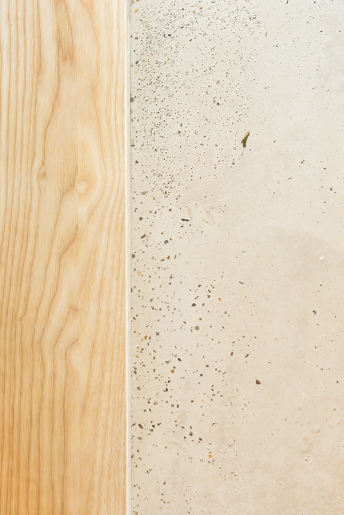 Umbau 50er Jahre Doppelhaushälfte Wollishofen Inventar Denkmalpflege | Fertigstellung Juni 2017 | Bilder nijo architekten Das Doppelhaus wurde 1956 zusammen mit 3 weiteren typengleichen Doppelhäusern sowie zwei Mehrfamilienhäusern als Wohnsiedlung am Stadtrand von Zürich Wollishofen an der Kilchbergstrasse gebaut. Geplant und gebaut haben die Siedlung ein Architektenteam von Mitarbeitern des städtischen Hochbauamtes. Bestimmend für die gemeinsame Entwicklungsarbeit waren: Die Wohnpflicht auf Stadtgebiet und individuelle Wohnansprüche ohne Vernachlässigung des Gemeinsamen. Die Siedlung ist aussen mehr oder weniger nahe dem Originalzustand, hervorzuheben ist die hinterlüftete Alumandachhaut (Fural-Dach), welche sich in einem immer noch guten Zustand befindet. Im Inneren wurden die Haushälften individuell je nach Vorlieben ausgebaut, die Grundrisstruktur ist jedoch überall die selbe: Auf der Südseite des Erdgeschosses liegt das Essplatz-Podest mit einem um zwei Stufen tiefer liegenden Wohnraum mit angegliedertem Arbeitszimmer, im rückwärtigen Bereich ein Schlafzimmer mit Mini-Bad, ein sehr enger Gang mit Mini-Küche und einem sehr knapp bemessenen Eingangsbereich. Die geschlossene Küche ist durch einen beidseitig öffenbaren Küchenschrank mit dem Essplatz verbunden. Im oberen Geschoss befinden sich zwei Kinderzimmer. Der Umbau konzentriert sich auf die Öffnung der Küche zum Wohnraum hin. Diese Öffnung kam daher, dass der bestehende Küchenraum zu klein war für eine zwar immer noch bescheidene, aber zeitgemässe Küche, Herd und Kühlschrank fanden keinen Platz. In Absprache mit der Denkmalpflege wurde vereinbart, dass die vorherige Küchenschrank-Trennwand sorgfältig abgebaut und im Keller des Hauses eingelagert werden darf. Die neue Küche ist aus Holz und Beton, die Holzfronten sind eine Referenz an die abgebaute Holz-Trennwand. Zum Arbeitszimmer hin wird der enge Durchgang verbreitert, ein Sichtbetonsturz wird den Eingriff ablesbar machen. Das Mini-Bad bleibt in seiner Form erhalten, wird aber neu ausgestaltet. Die Häuser sind schalltechnisch miserabel gebaut, die Bodenplatten sind zur Nachbarhälfte hin nicht getrennt sonder durchlaufend. Aus diesem Grund werden die Böden neu aufgebaut mit bestmöglicher Trittschallisolation. Im gesamten Haus werden neu Anhydritböden gegossen und farblos eingeölt. Schadstoffmessungen haben ergeben, dass im Haus Asbest und PCB verbaut worden sind, diese Schadstoffe werden fachgerecht rückgebaut und entsorgt.