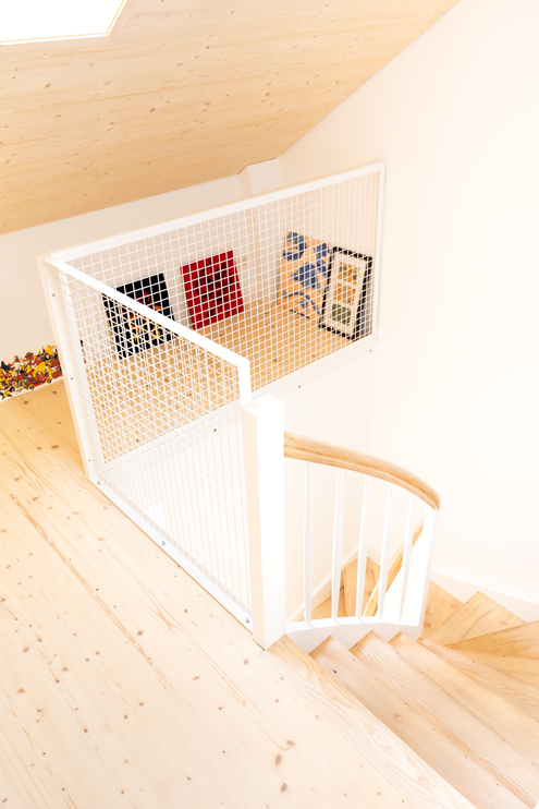 Einbau Dachzimmer in offenen Wohnraum, Seebach Planung 2024 | Fertigstellung September 2024 | Fotos nijo architekten Das 1930 gebaute Haus haben wir bereits 2006 zu einer offenen Wohnhalle umgebaut, alle Zimmer bis auf ein einziges aufgelöst. Das Raumgefühl ist fantastisch, man wohnt, arbeitet und schläft wie unter einem grossen Zeltdach im offenen Raum. Mittlerweile ist die Familie gewachsen und es bestand Bedarf für ein Jugendzimmer. Dieses sollte einerseits Privatsphäre bieten, anderseits dennoch mit dem offenen Raumfluss in Verbindung bleiben. Wir haben das neue Zimmer wie ein Baumhaus unter dem Dach auf die offene Galerie gestellt, es kragt 150cm in den offenen Wohnraum. Diese Anordnung bot Gelegenheit, im gleichen Zuge auch die darunter liegende Küche neu zu organisieren. Das neue Holztragwerk ist wie eine raumhohe Wohnwand ausgestaltet. (In ähnlicher Form haben wir vor ein paar Jahren in Höngg ein Atelierhaus gestaltet) Die Holzstützen sind seitlich eingefräst, man kann dort Tablare oder Tischflächen einschieben oder auch einfach offen lassen, je nach Lust und Laune. Das Holztragwerk ist sorgfältig und aufwendig ineinandergefädelt und mit einem Touch japanischer Holzbaukunst schlüssig zusammengesteckt. Neuer Dreh- und Angelpunkt im offenen Raum bildet der in die Tragstruktur eingeschobene Kühlschrank/Backofen Block, gefertigt aus Kistensperrholz und fingergezinkten Esche-Schubladen. Das rückwärtige Regal war in anderer Form bereits im Haus, wir haben es recycelt und mit hochstehenden schmalen Schränken ergänzt. Das Farbkonzept für den Umbau ist einfach gehalten: Unbehandeltes Holz und in Porzellanerdengelb lackierte Bauteile. Durch die Umgestaltung wurde eine neue Treppe notwendig. Wir wollten sie möglichst kompakt und industriell halten, sie sollte sich nicht zu wichtig machen im Raum, eher wie ein weiteres hingestelltes Möbel wirken. Die Treppe ist aus Stahl, Gitter und Rautenblech hergestellt und ebenfalls in Porzellanerdengelb lackiert. Je nach Lichtstimmung mäandriert dieses Gelb von Warmbeige über Blassgelb zu Grüngelb. Die Treppe ist maximal steil gehalten, damit sie nicht zuviel Platz einnimmt. Das Sofa darunter hat sich zu einem beliebten Platz gemausert. Das neue Zimmer besitzt nach Süden ein grosses rundes innenliegendes Fenster, damit die Südsonne durch das angrenzende Dachfenster herein kommt. Zudem hat man von hier via Küchenfenster einen prima Blick hinab in den Garten und auf die Strasse.